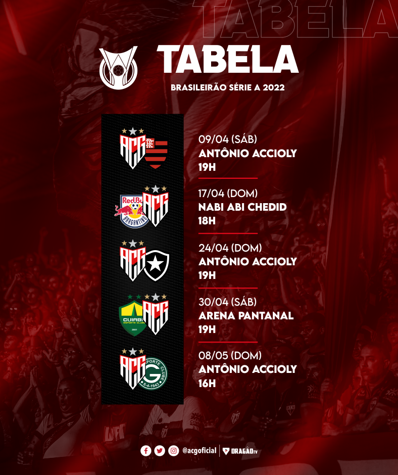 O primeiro jogo fora de casa será em Bragança Paulista, contra o Red Bull Bragantino. O Atlético ainda enfrenta Botafogo e Goiás em casa e o Cuiabá fora.