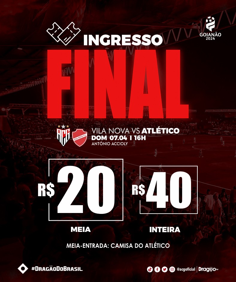 O Atlético inicia, nesta terça-feira (02), a venda de ingressos para o jogo contra o Vila NOVA, que acontecerá no domingo (07), às 16h00, no Estádio Antônio Accioly. O jogo marca a grande final do Campeonato Goiano 2024.